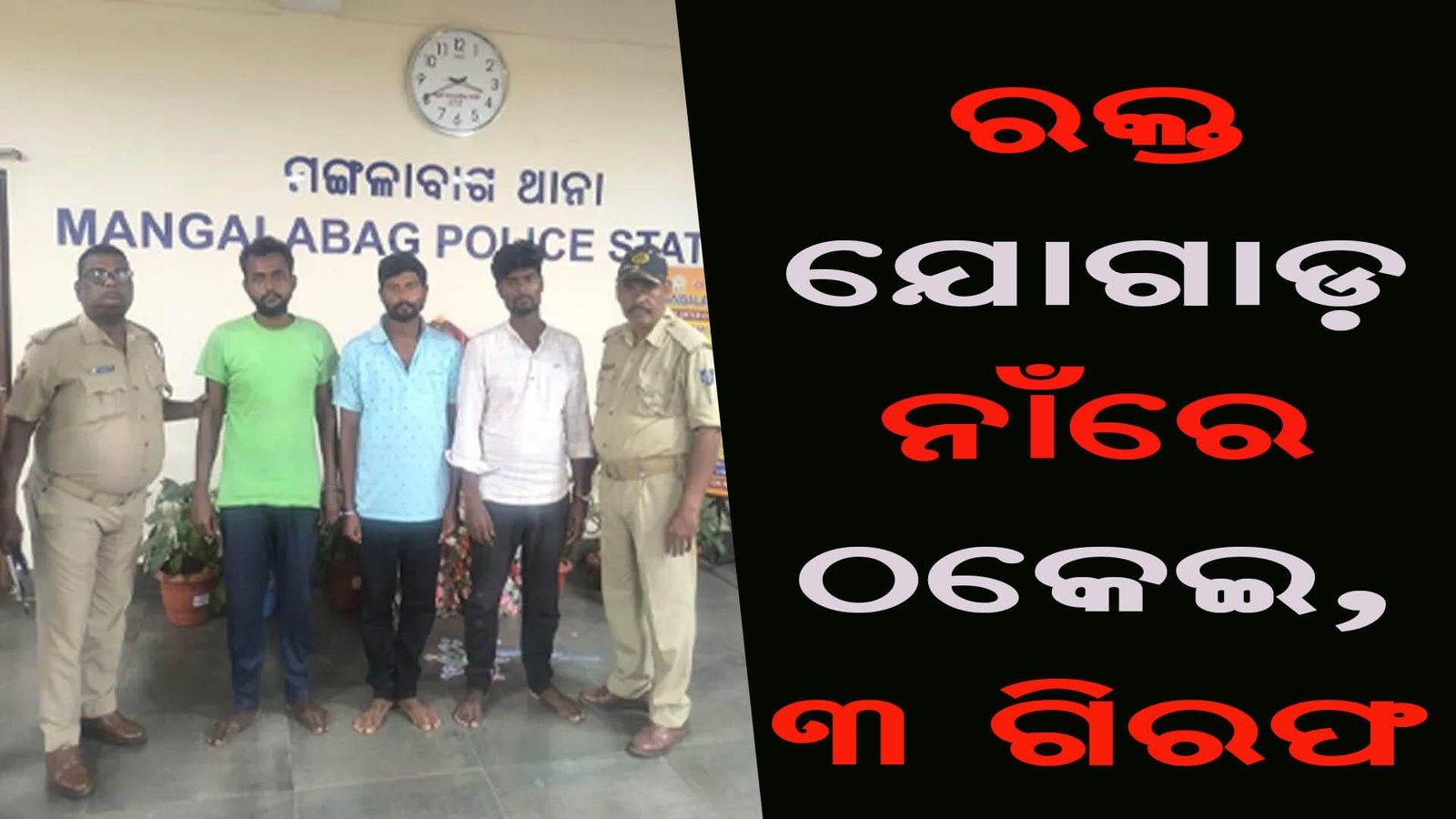 ଆଜି ମଙ୍ଗଳବାଗ ଥାନା ପୁଲିସ ୩ଜଣ ରକ୍ତ କାରବାର କରୁଥିବା ୩ଜଣ ଦଲାଲଙ୍କୁ ଗିରଫ କରି କୋର୍ଟ ଚାଲାଣ କରିଛି । ଗିରଫ ତିନିଜଣ ହେଲେ ବରି ଅଂଚଳର ଶିବ ମହାନ୍ତି, କେନ୍ଦ୍ରାପଡ଼ାର ଅବିନାଶ ରାଉତ ଓ ଜଗତସିଂହପୁରର ଧନେଶ୍ୱର ମହାନ୍ତି ।